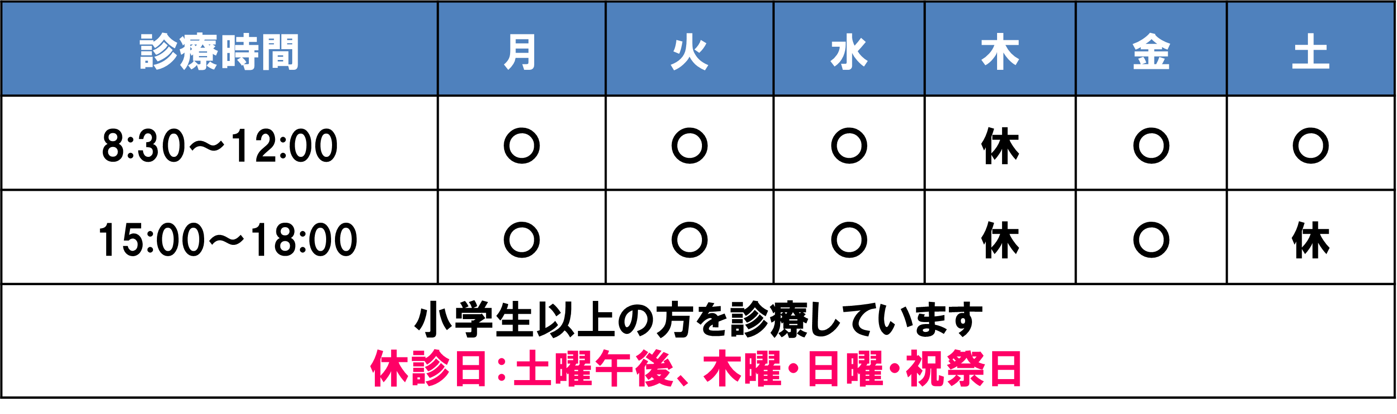 診療対象年齢を2023年4月1日より小学校1年生以上に変更するにあたり、インフルエンザ、日本脳炎、ジフテリア・破傷風(DT2種混合)ワクチンを除くすべてのワクチンを完全に予約制に移行します。目安としまして、1週間以上前までに窓口またはお電話でお申し込みください。よろしくお願いいたします。